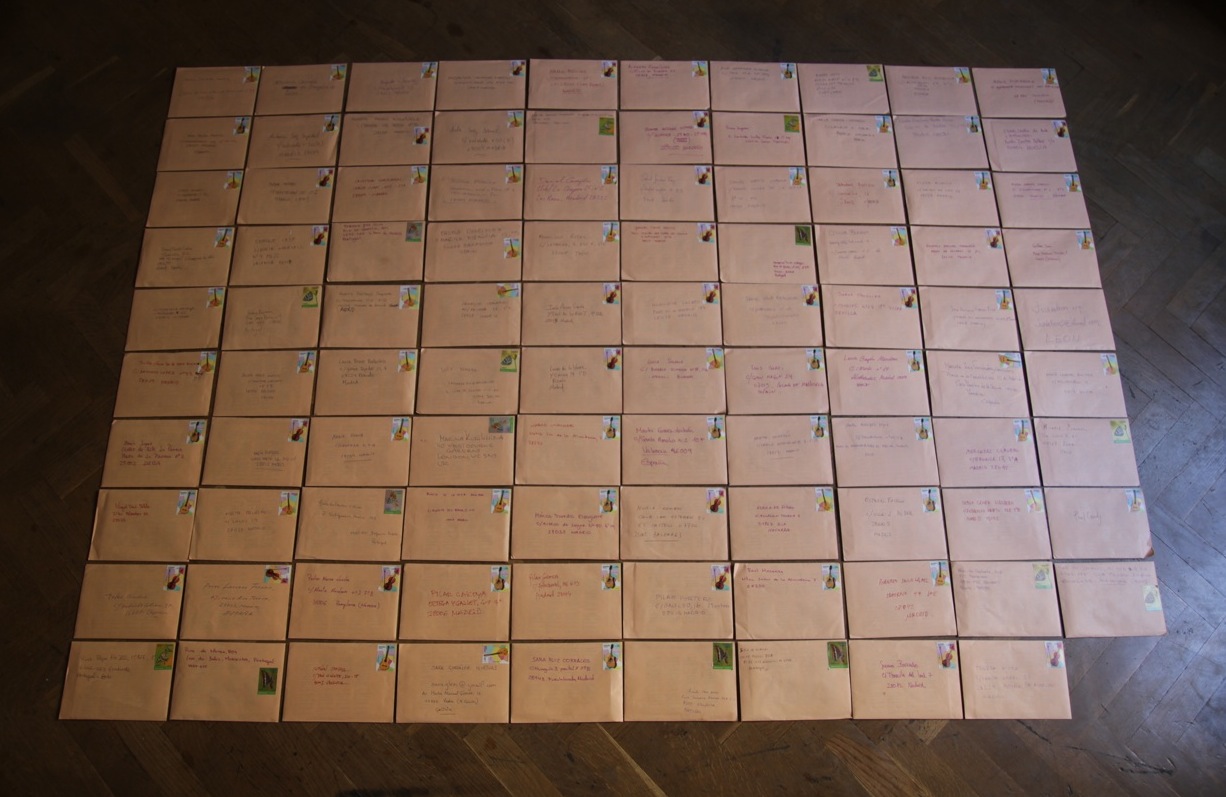 1 channel video, installation, performance, photographs, 99 envelopes